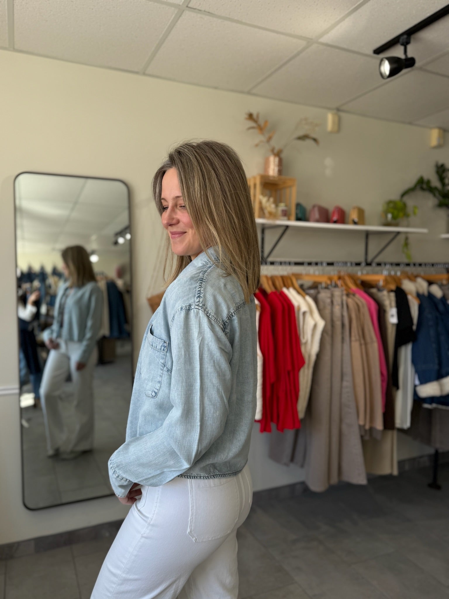 Featuring a classic collar, button front closure, and a perfectly cropped length (21” high point from shoulder), this shirt hits just right at the waist — making it ideal for pairing with high-rise denim or layering over a tank.