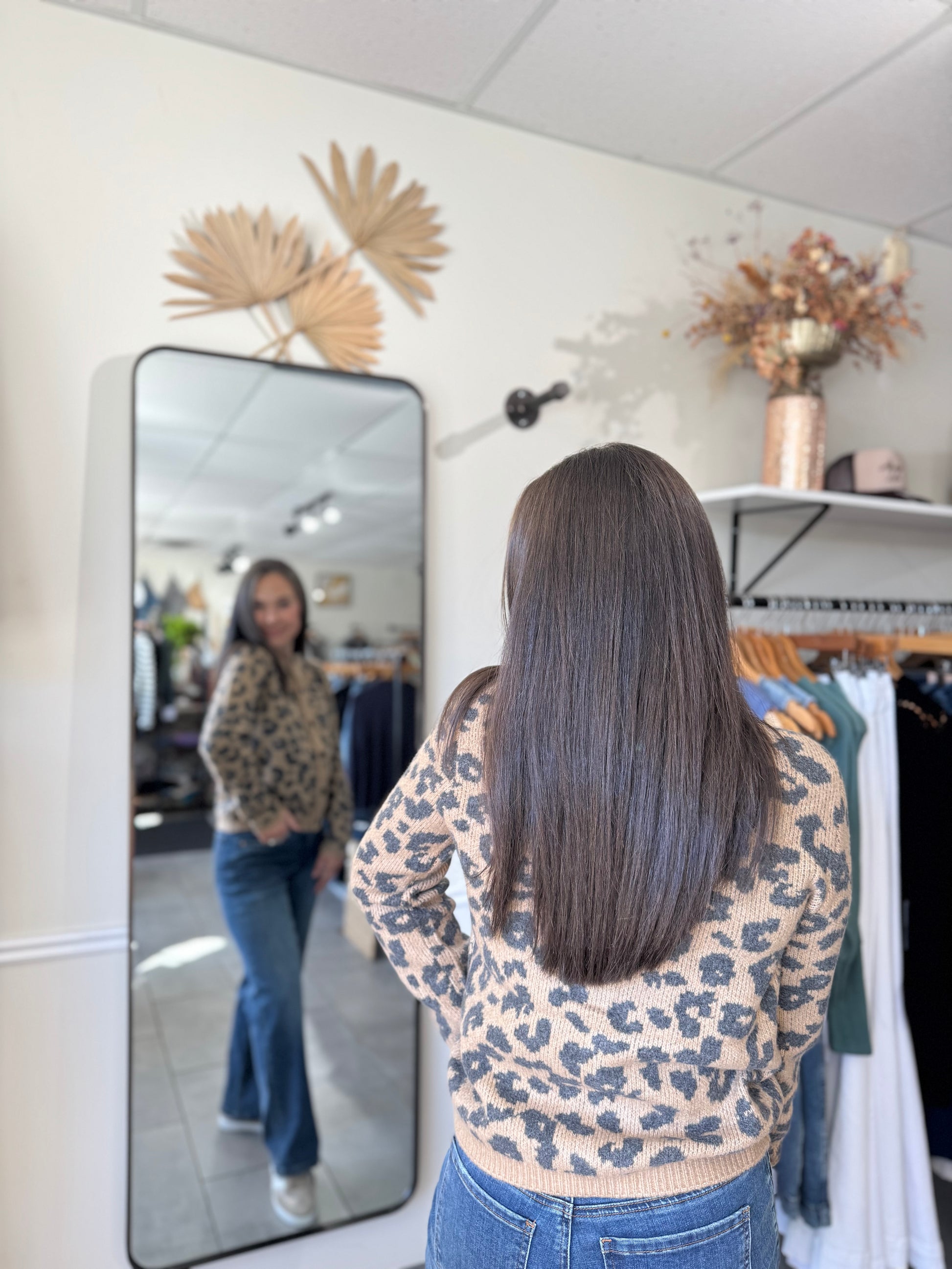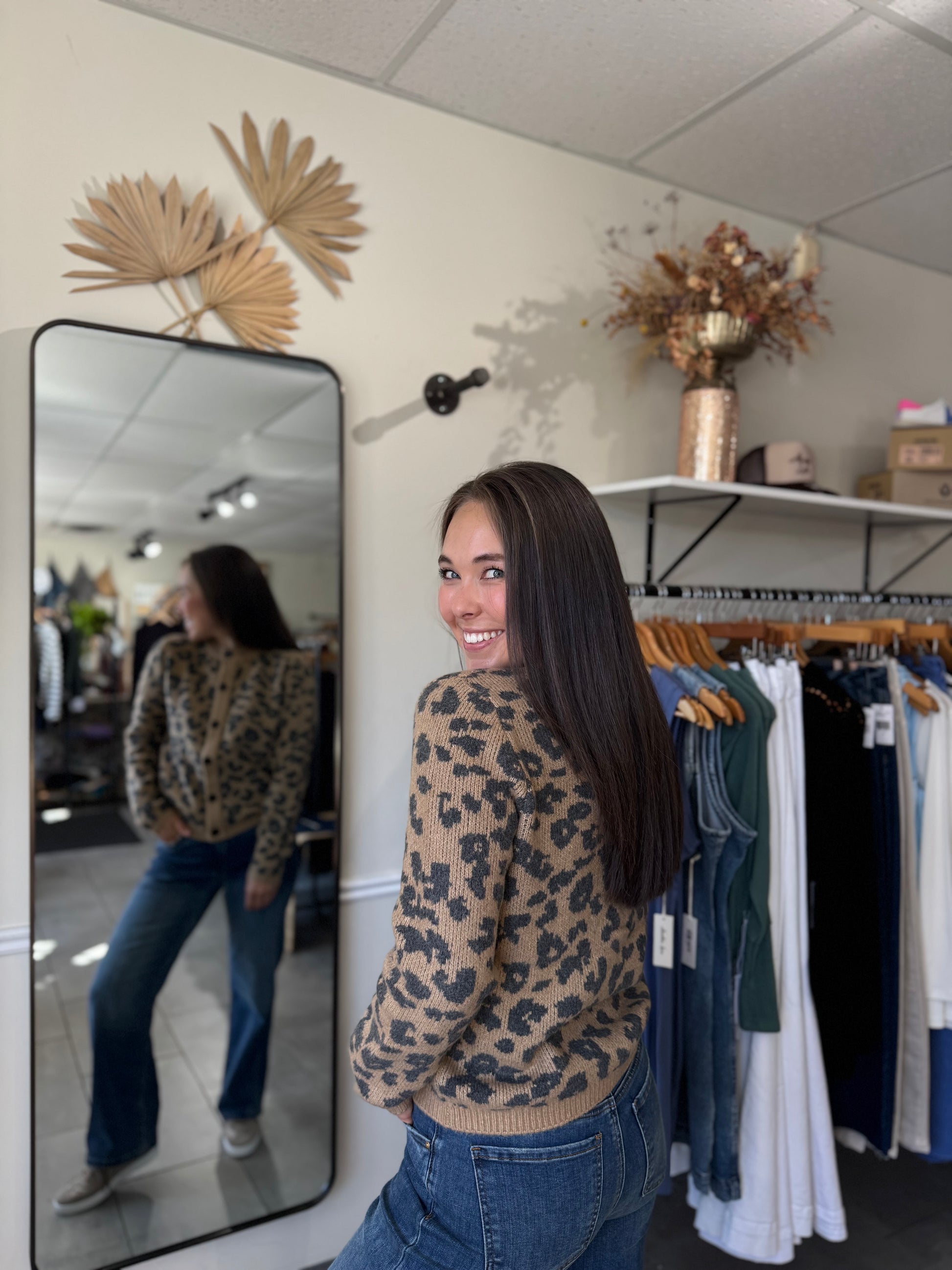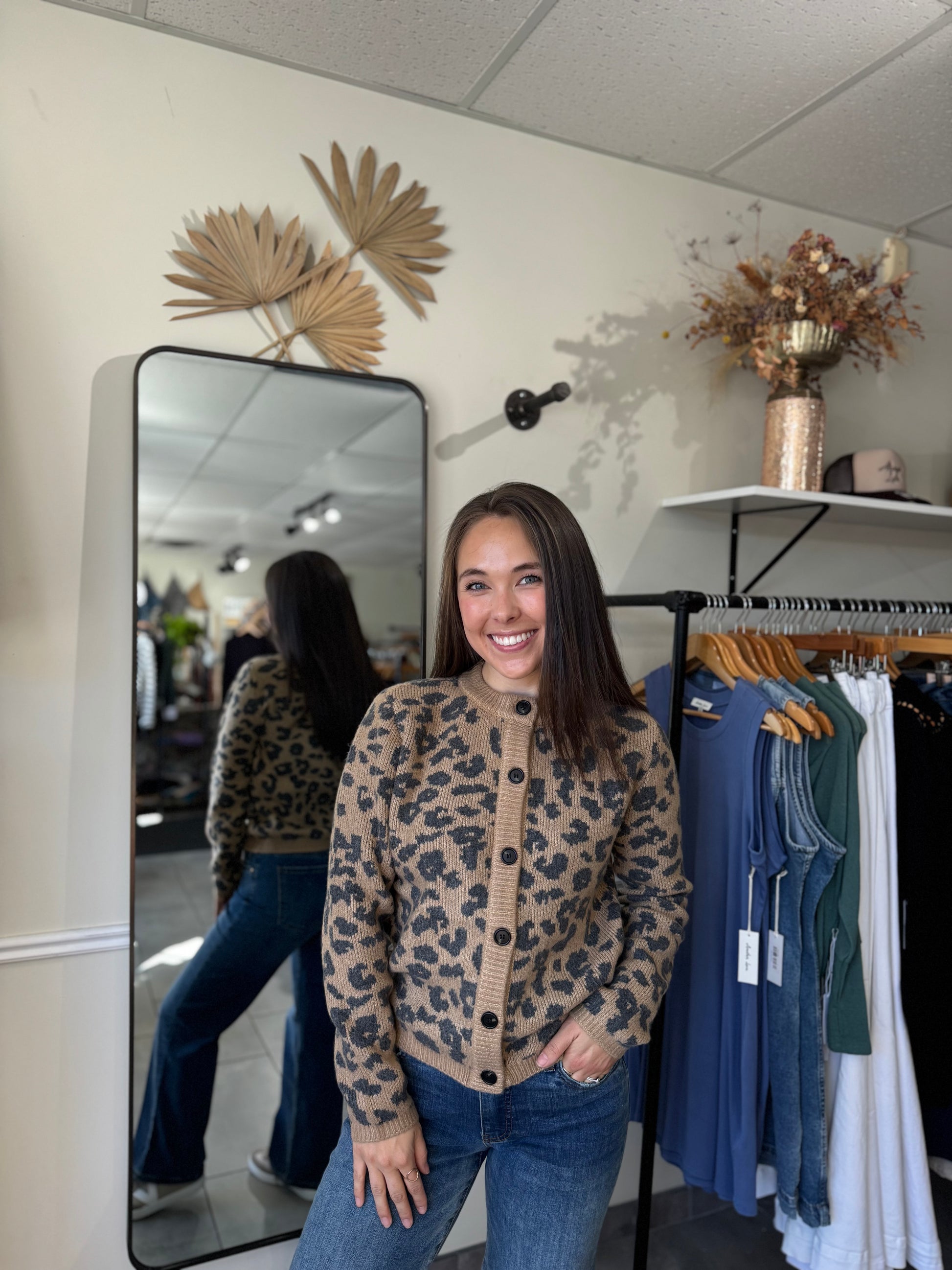 The Amina Cardigan features a stylish animal print in a patterned neutral palette, perfect for adding a subtle statement to your casual wardrobe. Crafted from a soft jacquard blend of polyester, nylon, acrylic, wood fibers, and spandex, it offers both comfort and stretch. Its long sleeves make it ideal for layering, keeping you cozy and effortlessly chic throughout the day.