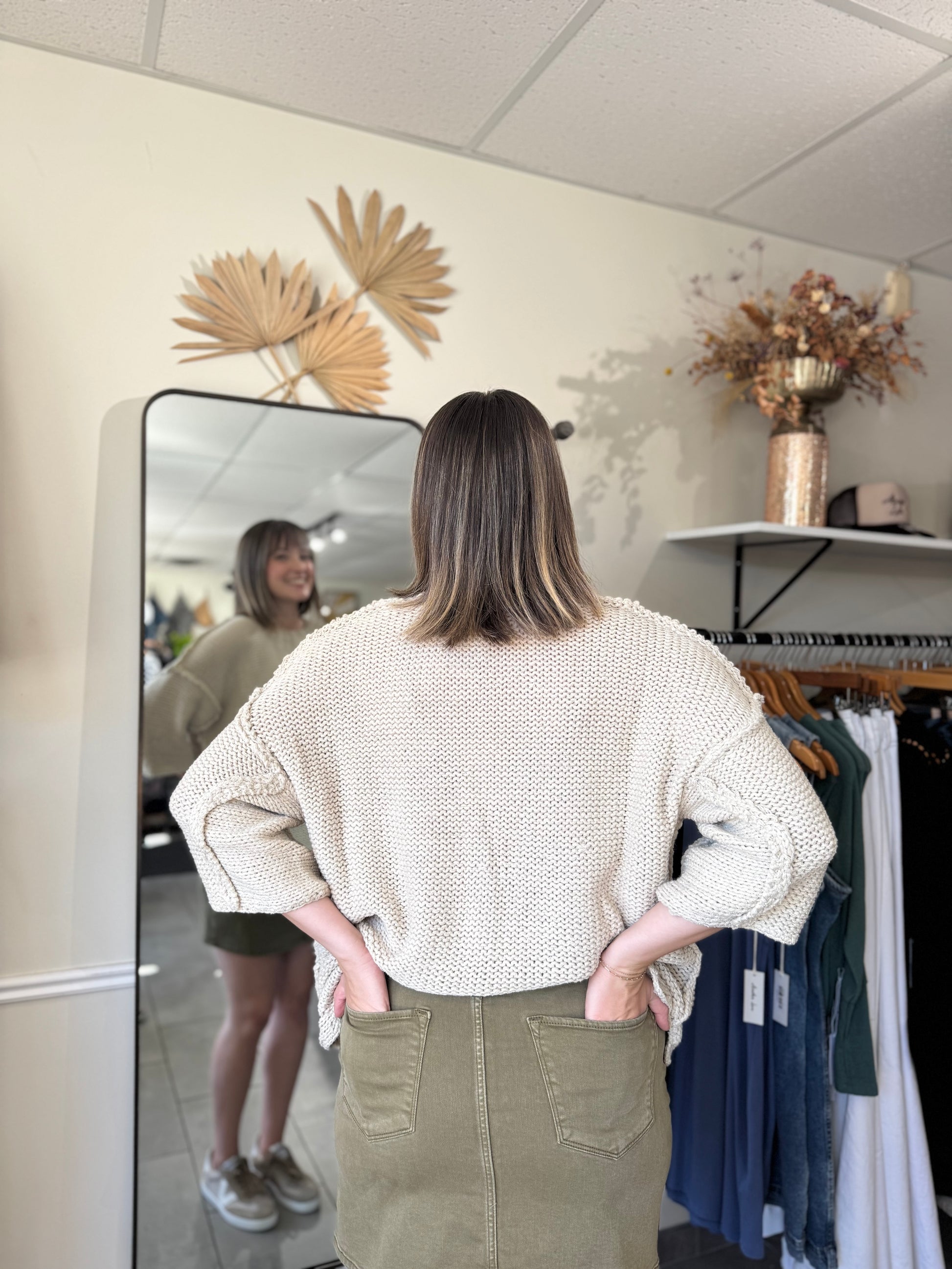 The Boxy Dolman Reverse Seam Top is the perfect mix of cozy comfort and modern style. Designed with an oversized silhouette, chunky knit fabric, and exposed seaming, this sweater top delivers a laid-back yet polished look.