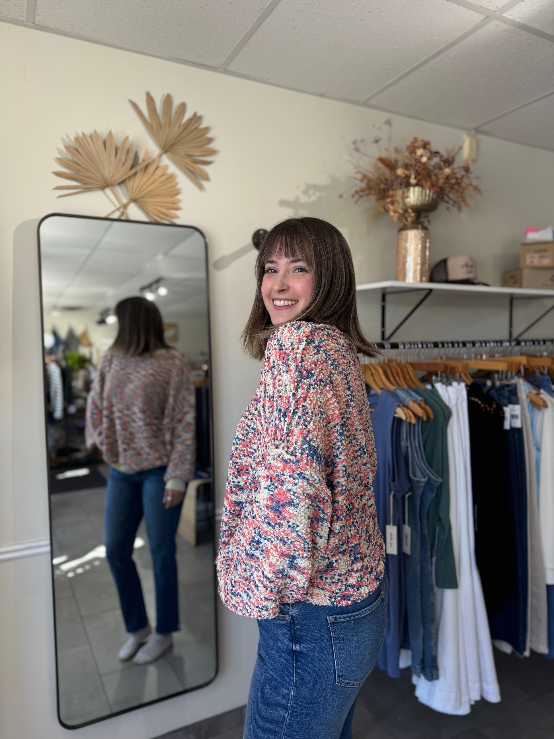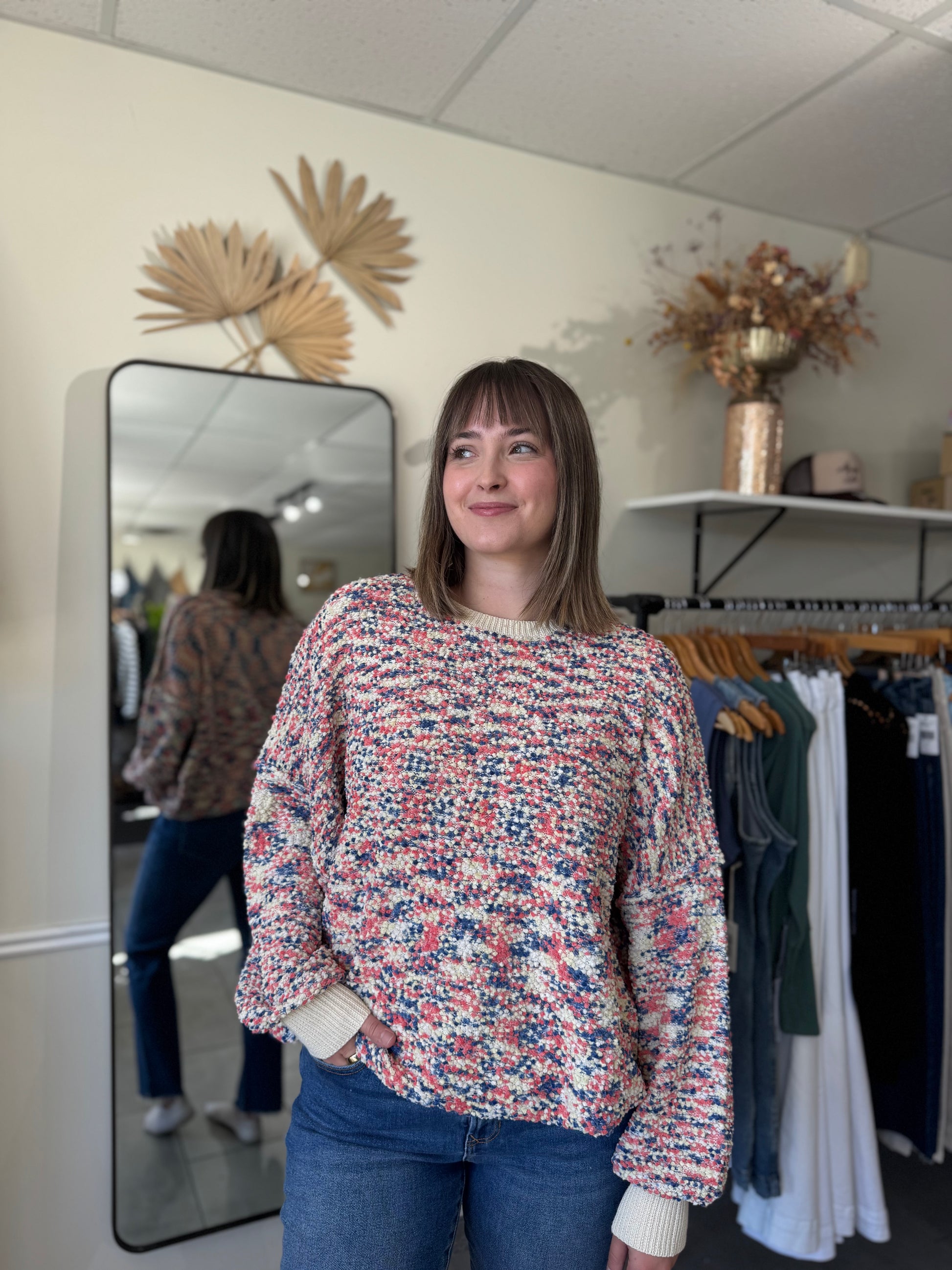 Add a pop of playful color to your wardrobe with the Confetti Dreams Sweater Pullover. Crafted from a cozy popcorn knit fabric, this relaxed and oversized piece offers the perfect blend of comfort and charm.