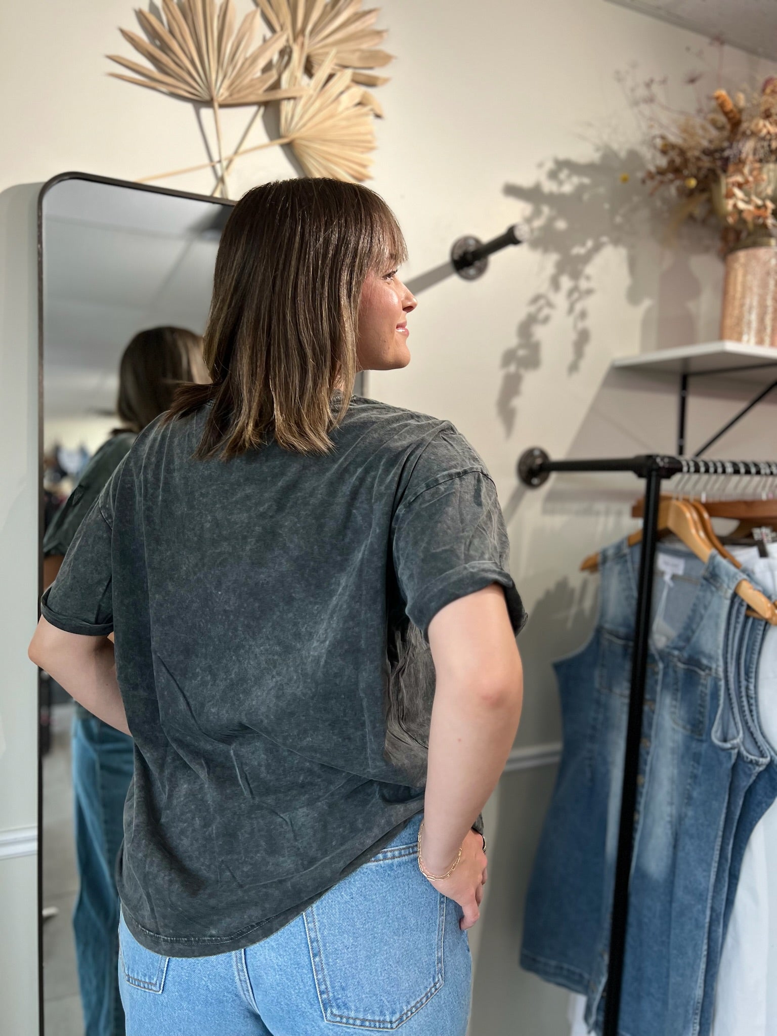 Designed in a mineral-washed black finish with a subtle grind-hem detail, it gives off that perfect worn-in, vintage feel. Pair it with denim cutoffs, cargo pants, or your favorite skirt for a versatile look that’s equal parts casual and cool.