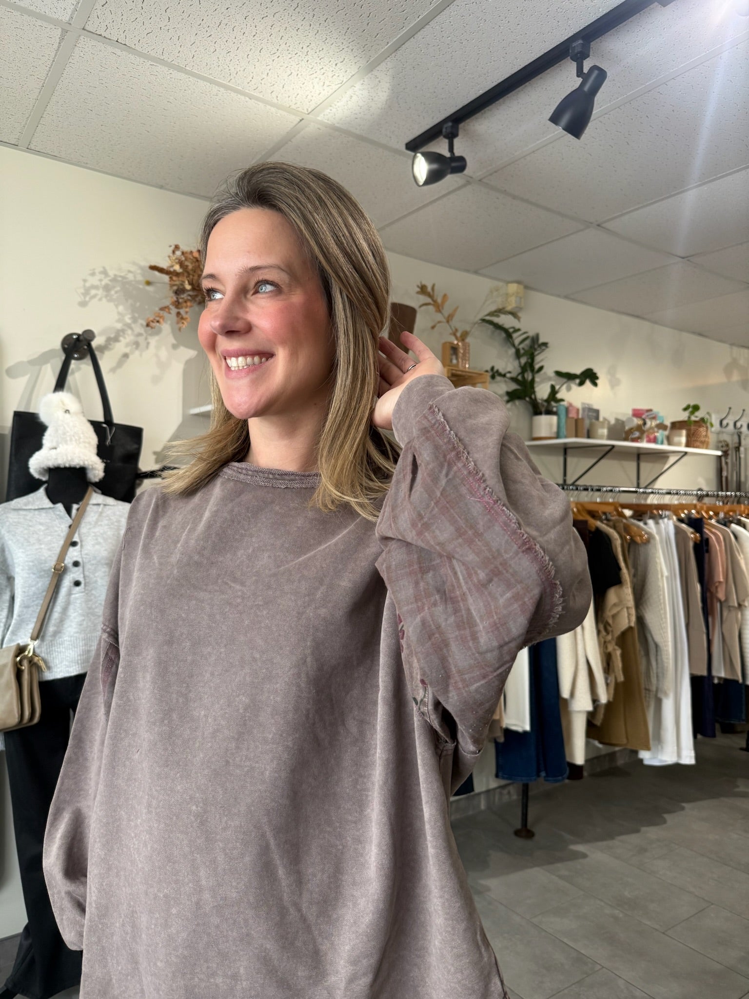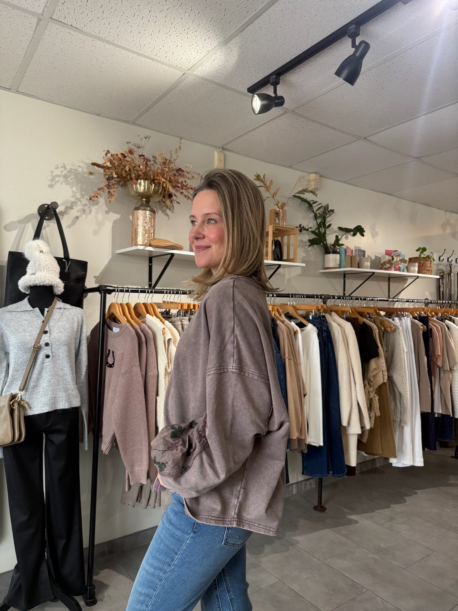 Stay effortlessly stylish with our Dolman Sleeve Washed Terry Pullover. Featuring an oversized, relaxed fit with dropped shoulders, this pullover combines comfort and unique design with patchwork floral and plaid contrast fabric and a small heart patch on the back.