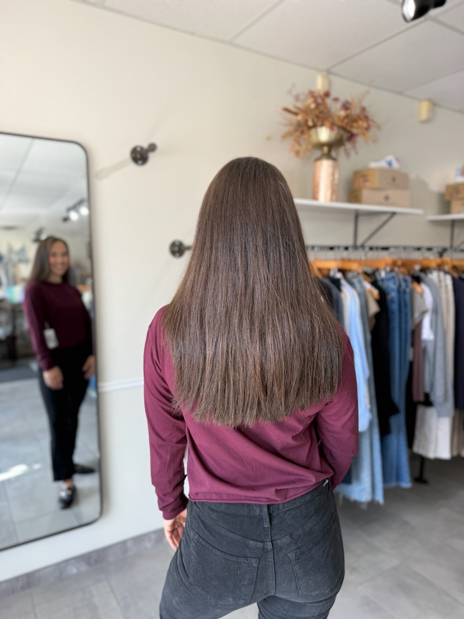 Featuring a chic crew neck and raw edge detailing, this top effortlessly combines timeless elegance with a modern twist, providing a go-to option for comfort for an elevated everyday look.
