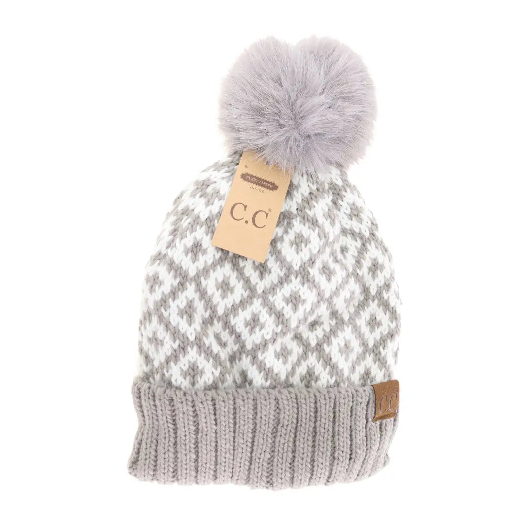 Fuzzy Lined Diamond Patterned Faux Fur Pom C.C Beanie
