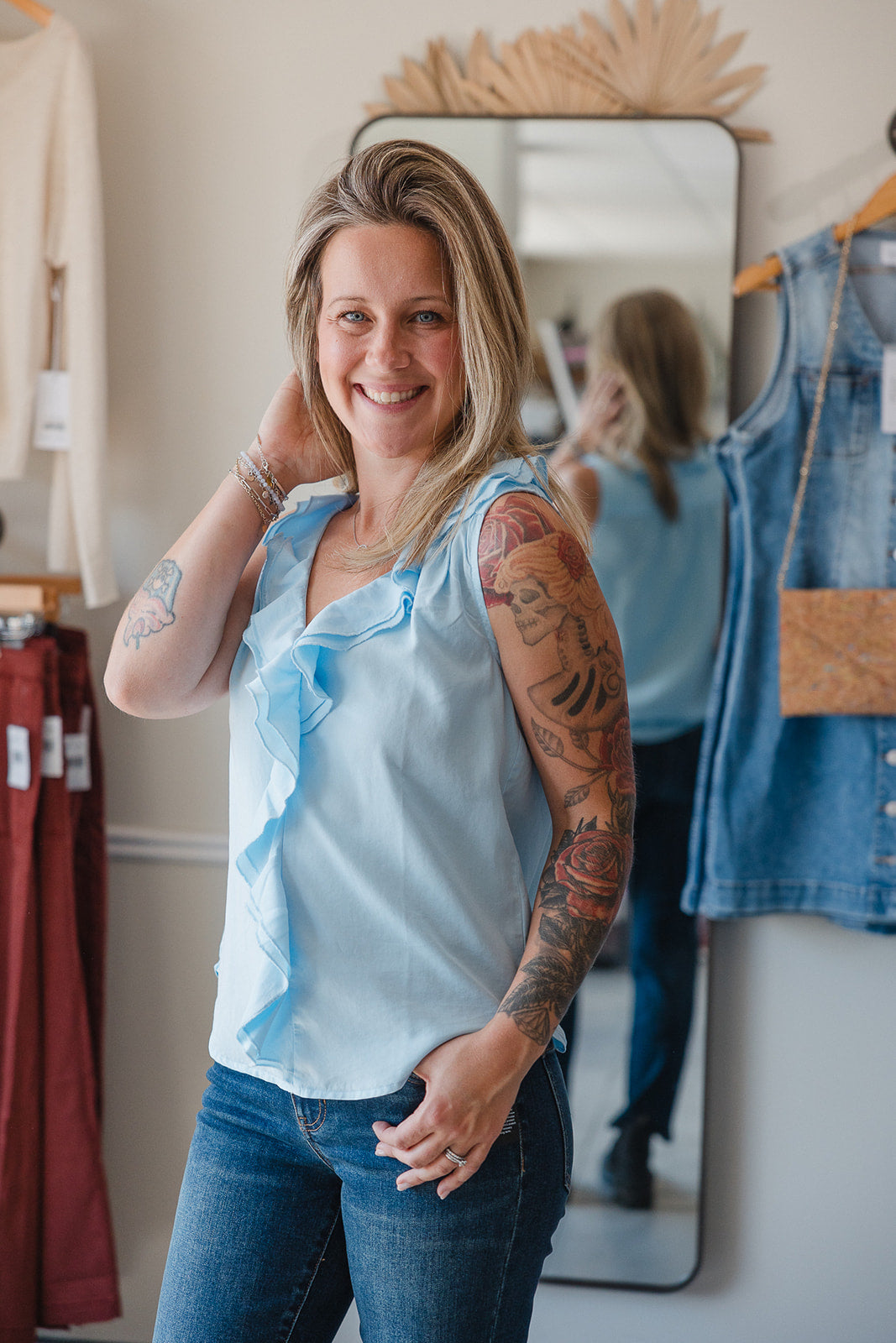- This sleeveless top features double ruffles in the front and a shirred back for a flattering, feminine fit. The delicate design adds a soft, romantic touch to any outfit, perfect for both casual and dressy occasions.