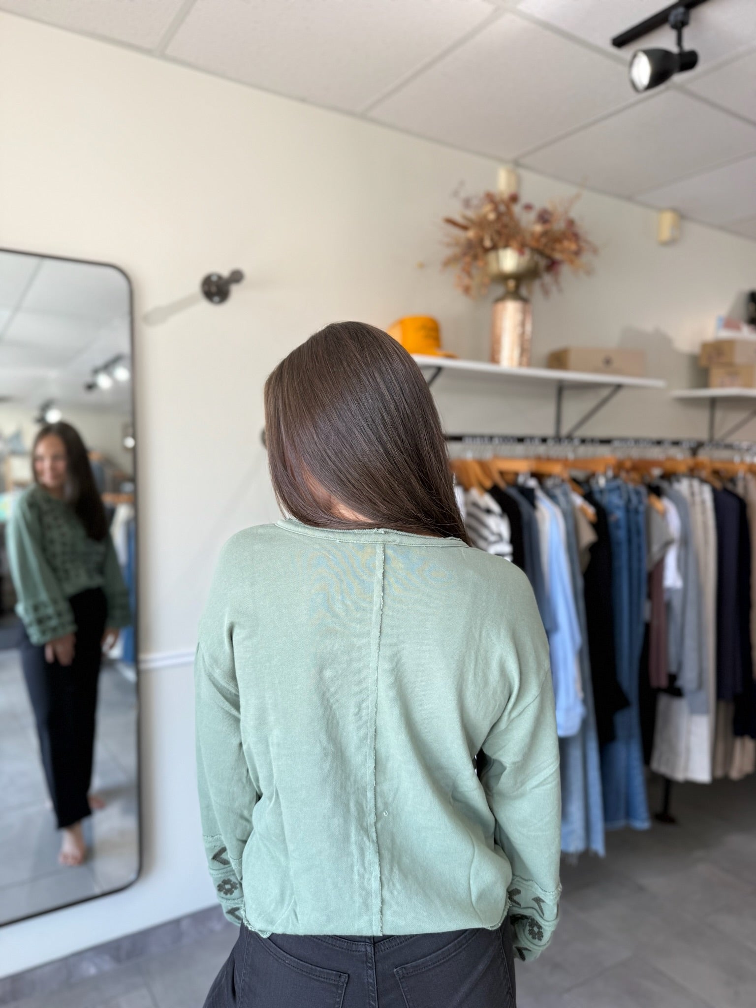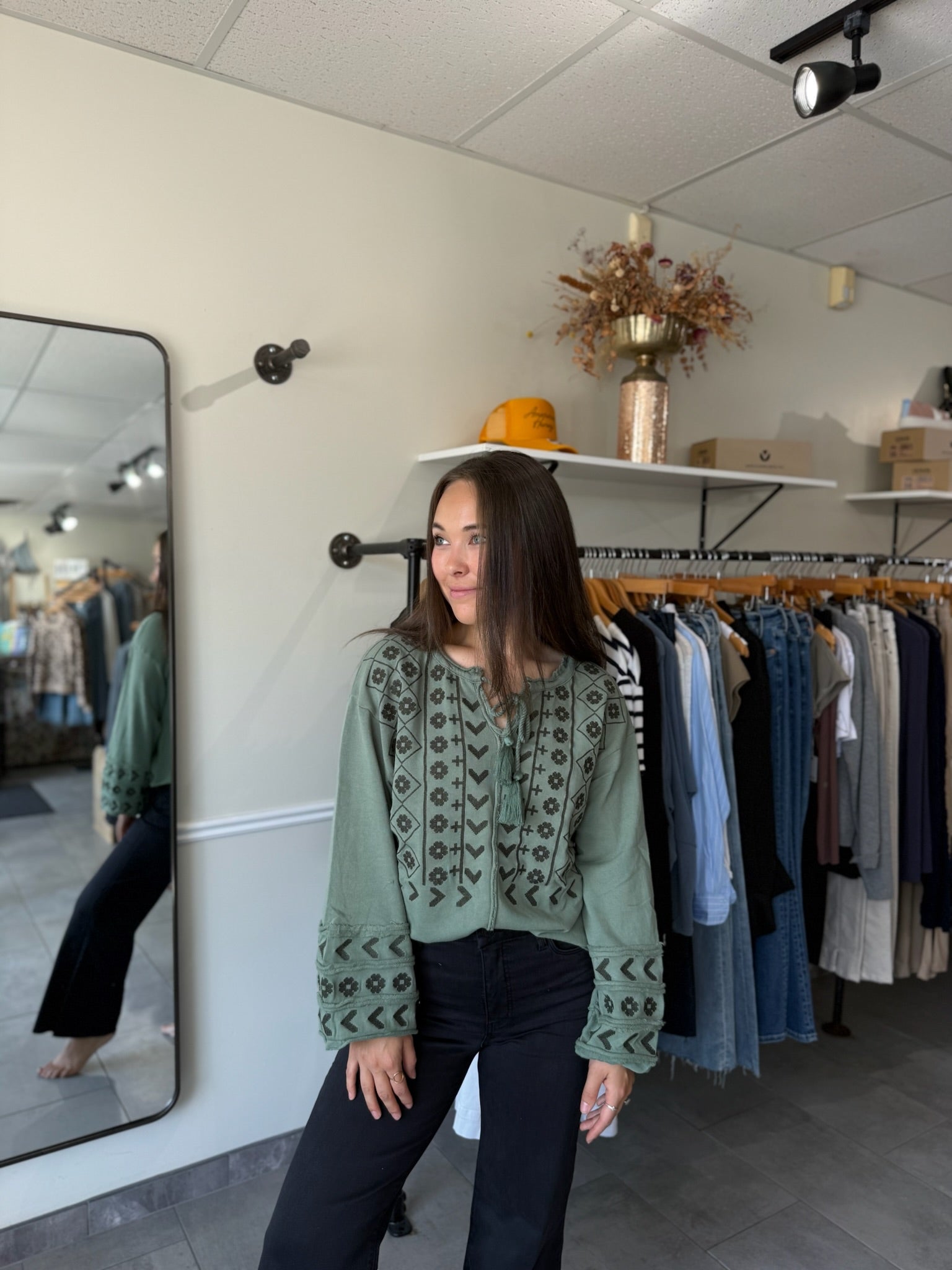 The Gilly Top in slate green features long puff sleeves and delicate embroidery, crafted from 100% cotton for breathable comfort. Its relaxed fit and charming details make it perfect for casual days when you want to feel stylish yet easygoing.