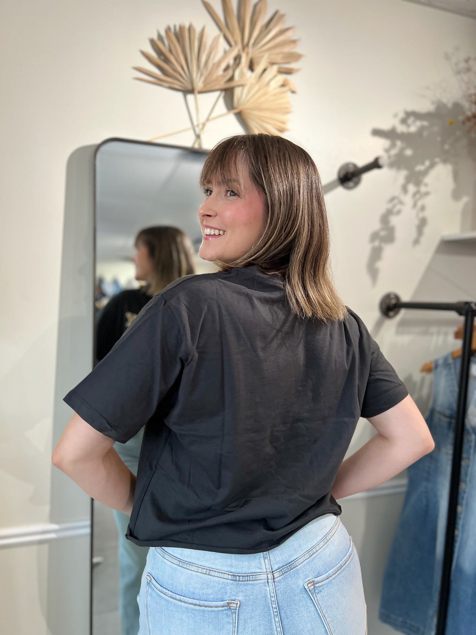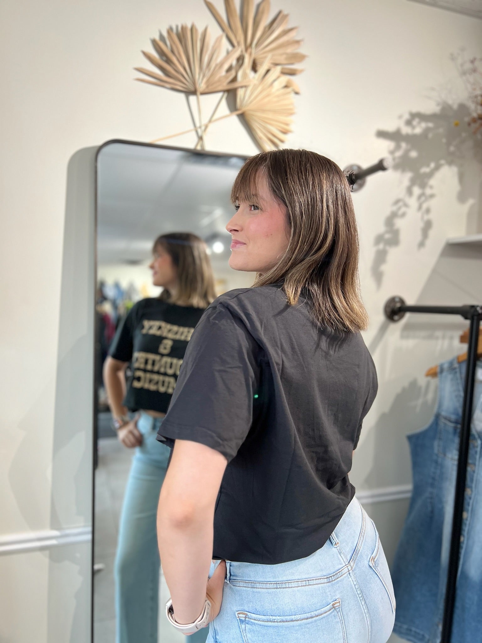 Show off your love for laid-back vibes with the Whiskey and Country Music Graphic Tee. Designed in classic black with short sleeves, this everyday essential pairs effortlessly with denim, leggings, or layered under a jacket for an easygoing look.